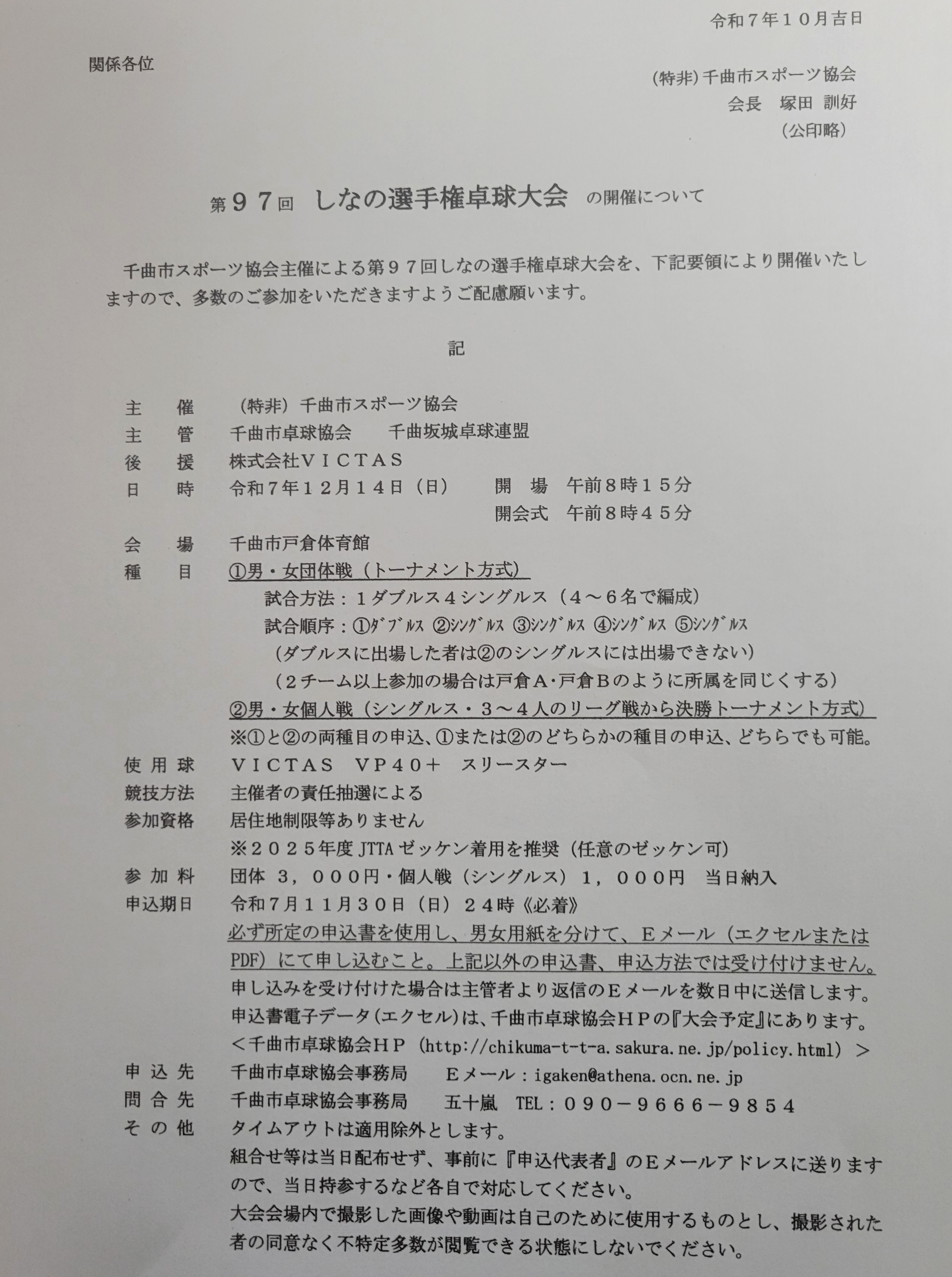 | 第97回しなの選手権卓球大会 |