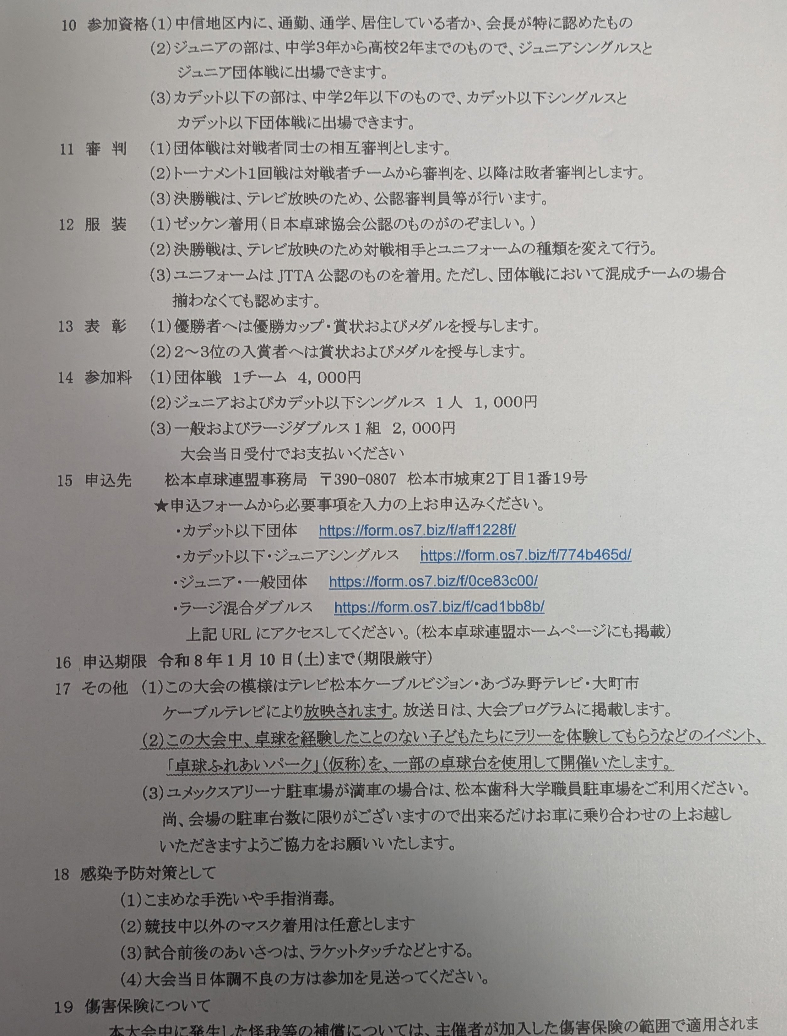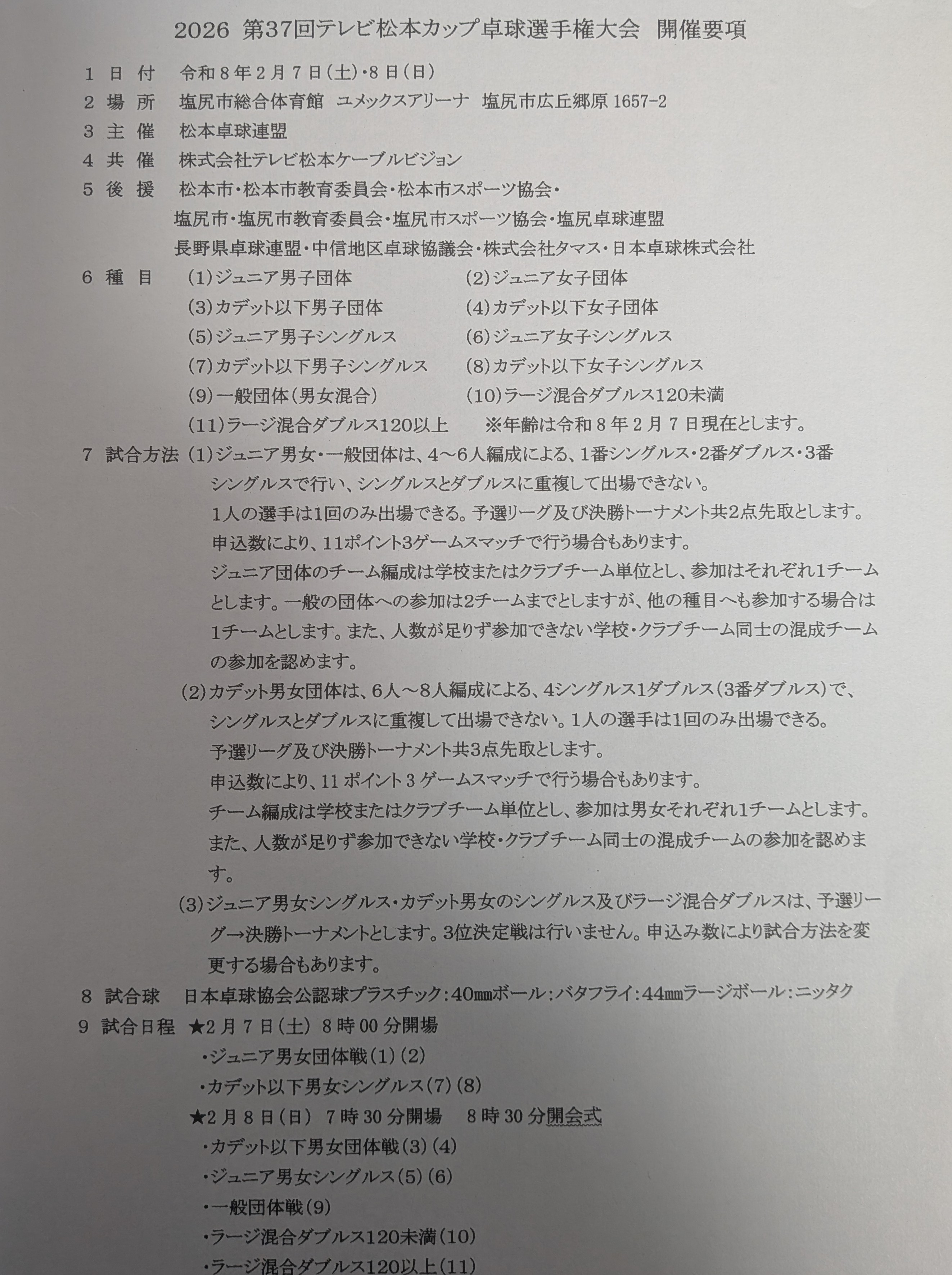 | 第37回テレビ松本カップ卓球選手権大会 |