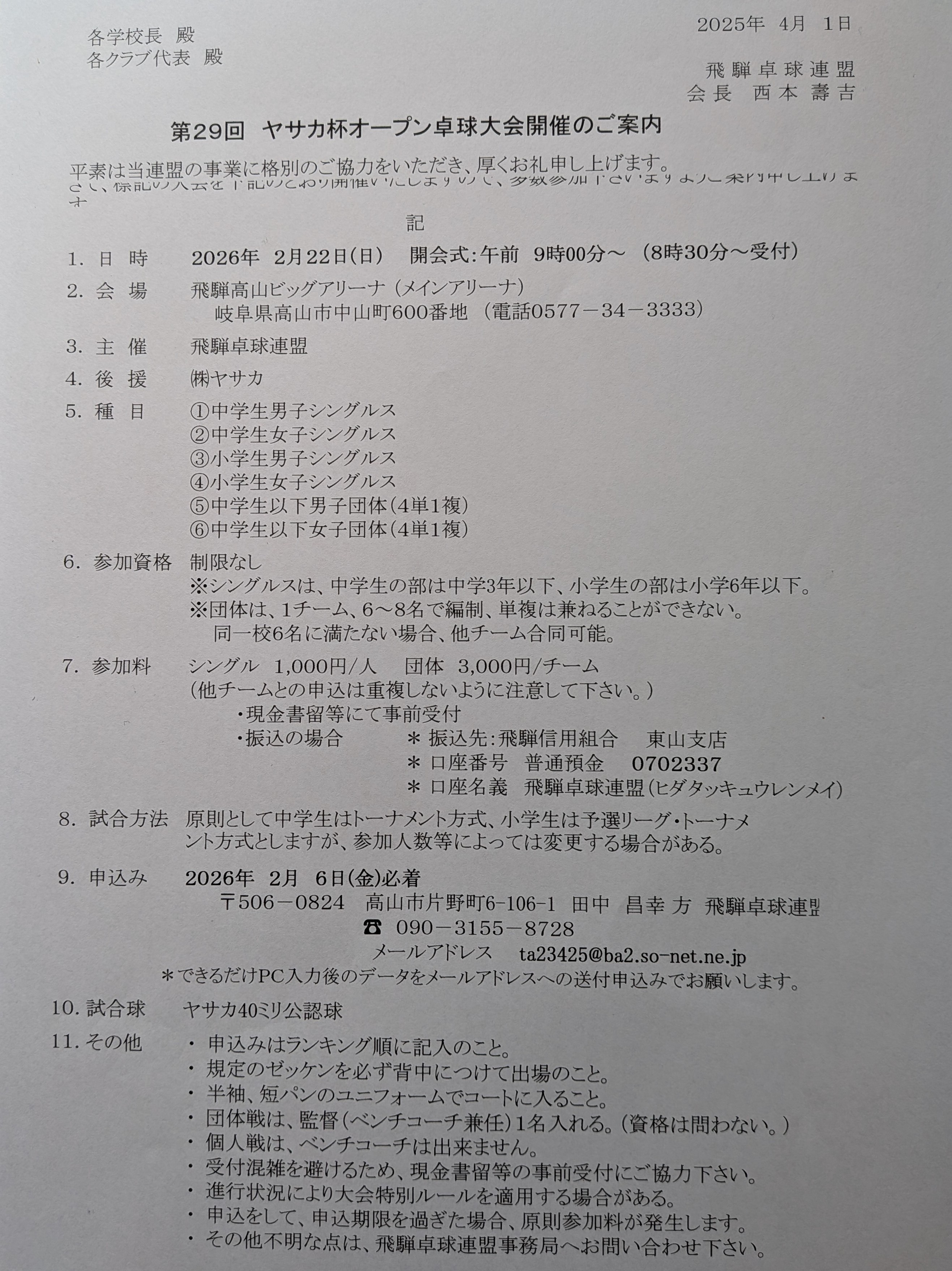 | 第29回 ヤサカ杯オープン卓球大会 |