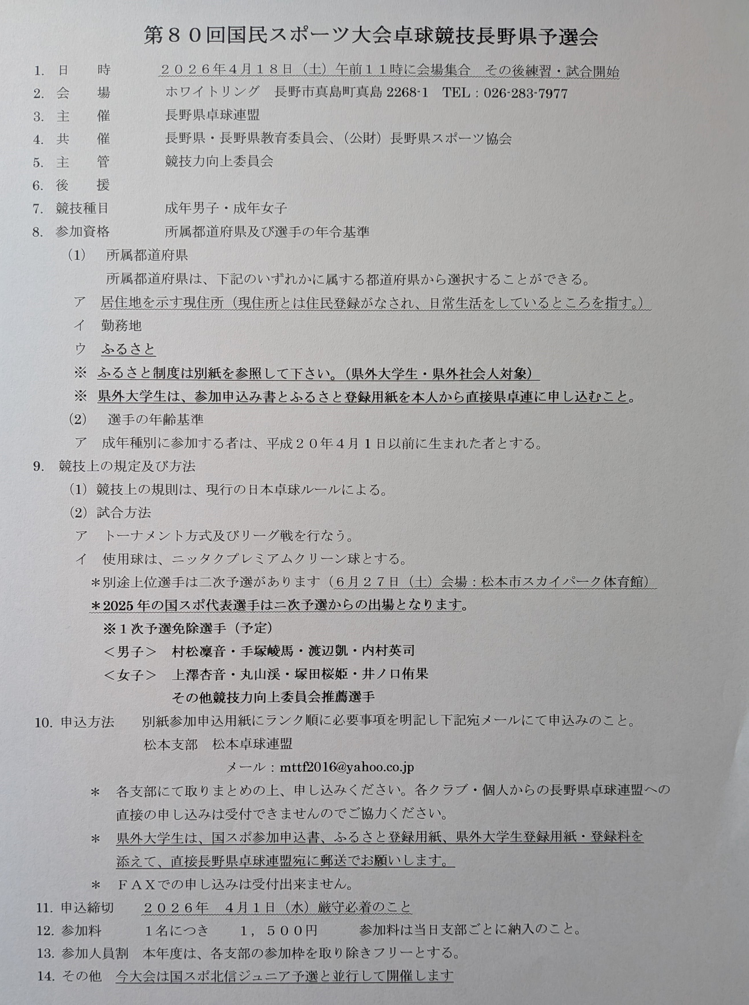 第80回 国民スポーツ大会(成年の部)長野県予選会
