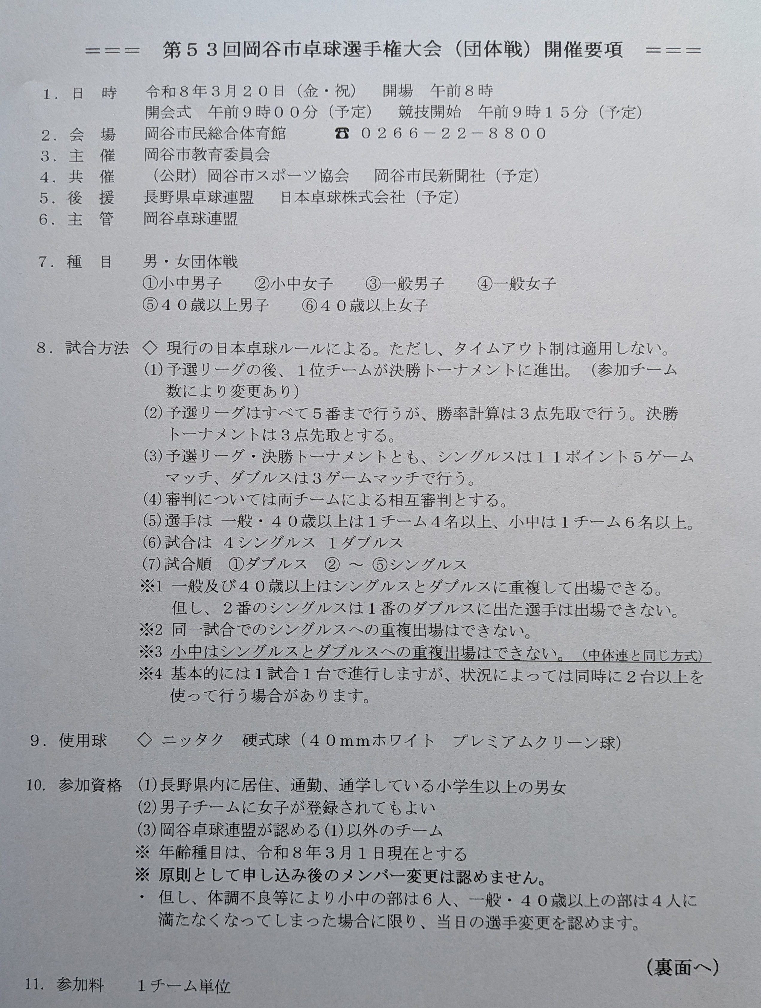 | 第53回岡谷市卓球選手権大会(団体戦) |