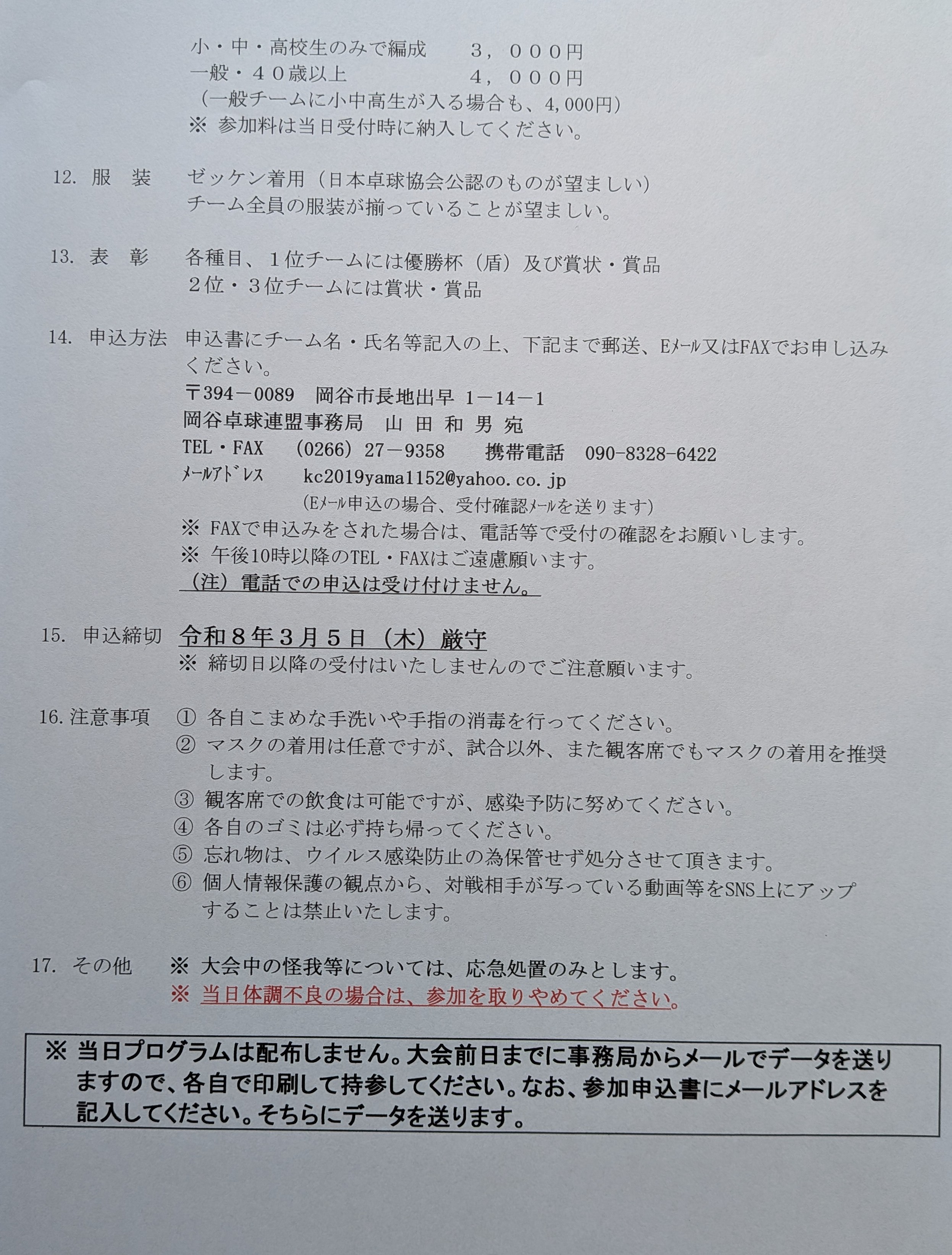 | 10. 参加料:小中=3,000円、一般=4,000円 |