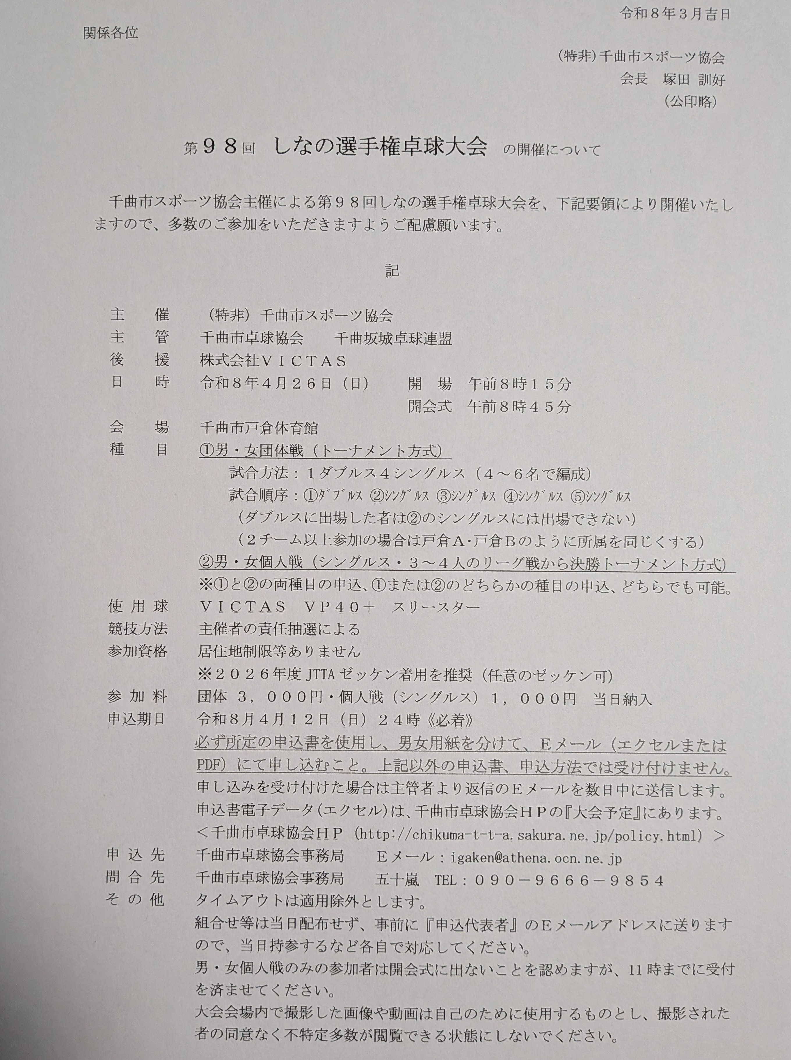 | 第98回しなの選手権卓球大会 |